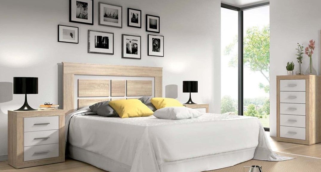 Dormitorio completo para cama de 150 compuesto por cabecero de ancho 160cm, dos mesitas de noche de 3 cajones de ancho 50cm y un sinfonier de 5 cajones con altura 106cm. Acabado blanco y cambria. Se sirve desmontado